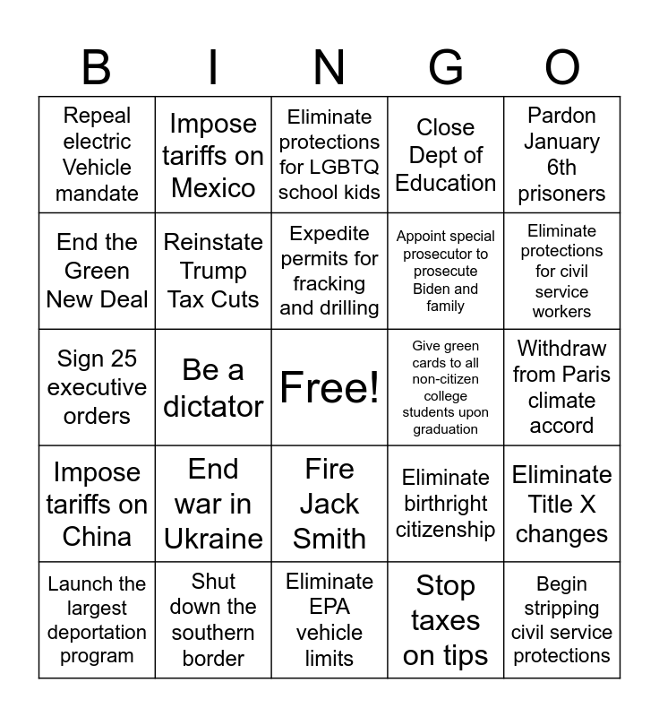 This bingo card has a free space and 24 words: End war in Ukraine, Shut down the southern border, Expedite permits for fracking and drilling, Launch the largest deportation program, Pardon January 6th prisoners, Repeal electric Vehicle mandate, End the Green New Deal, Impose tariffs on Mexico, Give green cards to all non-citizen college students upon graduation, Fire Jack Smith, Appoint special prosecutor to prosecute Biden and family, Sign 25 executive orders, Eliminate birthright citizenship, Eliminate Title X changes, Reinstate Trump Tax Cuts, Stop taxes on tips, Withdraw from Paris climate accord, Eliminate protections for LGBTQ school kids, Eliminate protections for civil service workers, Be a dictator, Begin stripping civil service protections, Impose tariffs on China, Close Dept of Education and Eliminate EPA vehicle limits.