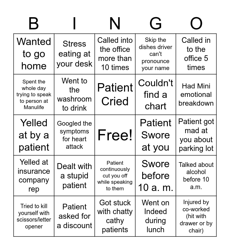 This bingo card has a free space and 24 words: Dealt with a stupid patient, Patient asked for a discount, Patient Cried, Tried to kill yourself with scissors/letter opener, Called in to the office 5 times, Wanted to go home, Spent the whole day trying to speak to person at Manulife, Stress eating at your desk, Patient Swore at you, Patient continuously cut you off while speaking to them, Couldn't find a chart, Yelled at by a patient, Swore before 10 a. m., Talked about alcohol before 10 a.m., Went to the washroom to drink, Went on Indeed during lunch, Patient got mad at you about parking lot, Called into the office more than 10 times, Had Mini emotional breakdown, Googled the symptoms for heart attack, Injured by co-worked (hit with drawer or by chair), Yelled at insurance company rep, Skip the dishes driver can't pronounce your name and Got stuck with chatty cathy patients.
