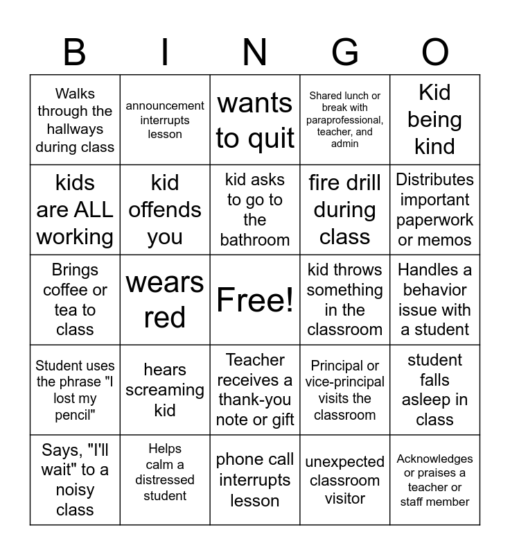 This bingo card has a free space and 24 words: hears screaming kid, Helps calm a distressed student, kid asks to go to the bathroom, Says, "I'll wait" to a noisy class, Kid being kind, Walks through the hallways during class, kids are ALL working, announcement interrupts lesson, kid throws something in the classroom, Teacher receives a thank-you note or gift, fire drill during class, Brings coffee or tea to class, Principal or vice-principal visits the classroom, student falls asleep in class, kid offends you, unexpected classroom visitor, Handles a behavior issue with a student, wants to quit, Distributes important paperwork or memos, wears red, Acknowledges or praises a teacher or staff member, Student uses the phrase "I lost my pencil", Shared lunch or break with paraprofessional, teacher, and admin and phone call interrupts lesson.
