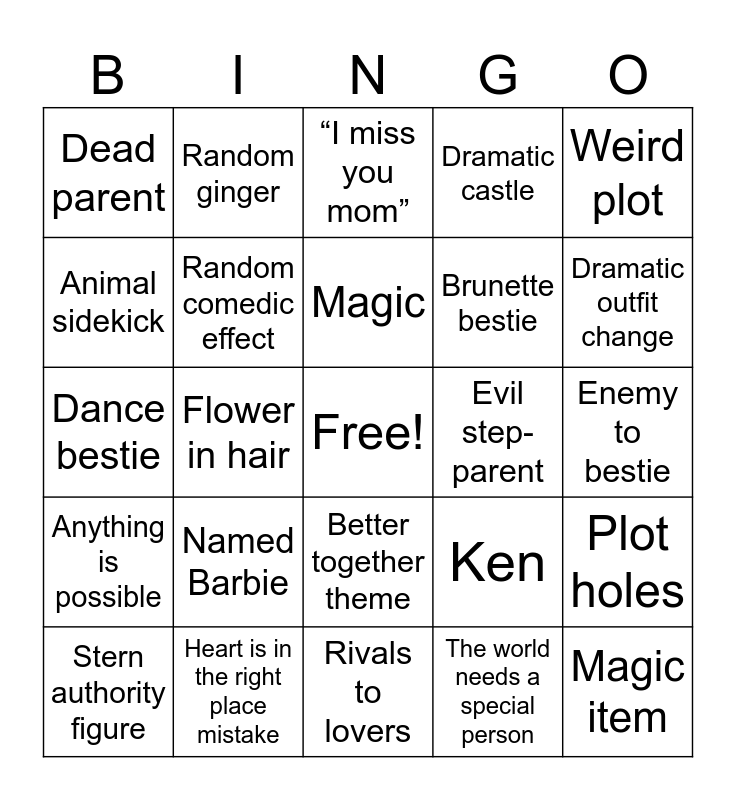 This bingo card has a free space and 24 words: Named Barbie, Heart is in the right place mistake, Magic, Stern authority figure, Weird plot, Dead parent, Animal sidekick, Random ginger, Evil step-parent, Better together theme, Brunette bestie, Dance bestie, Ken, Plot holes, Random comedic effect, The world needs a special person, Enemy to bestie, “I miss you mom”, Dramatic outfit change, Flower in hair, Magic item, Anything is possible, Dramatic castle and Rivals to lovers.