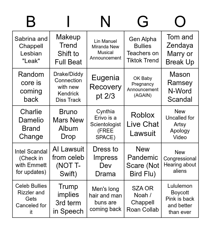 This bingo card has a free space and 24 words: AI Lawsuit from celeb (NOT T-Swift), Trump implies 3rd term in Speech, Eugenia Recovery pt 2/3, Celeb Bullies Rizzler and Gets Canceled for it, Tom and Zendaya Marry or Break Up, Sabrina and Chappell Lesbian "Leak", Random core is coming back, Makeup Trend Shift to Full Beat, Roblox Live Chat Lawsuit, Dress to Impress Dev Drama, OK Baby Pregnancy Announcement (AGAIN), Charlie Damelio Brand Change, New Pandemic Scare (Not Bird Flu), New Congressional Hearing about aliens, Drake/Diddy Connection with new Kendrick Diss Track, SZA OR Noah / Chappell Roan Collab, New Uncalled for Artsy Apology Video, Lin Manuel Miranda New Musical Announcement, Mason Ramsey N-Word Scandal, Bruno Mars New Album Drop, Lululemon Boycott Pink is back and better than ever, Intel Scandal (Check in with Emmett for updates), Gen Alpha Bullies Teachers on Tiktok Trend and Men's long hair and man buns are coming back.