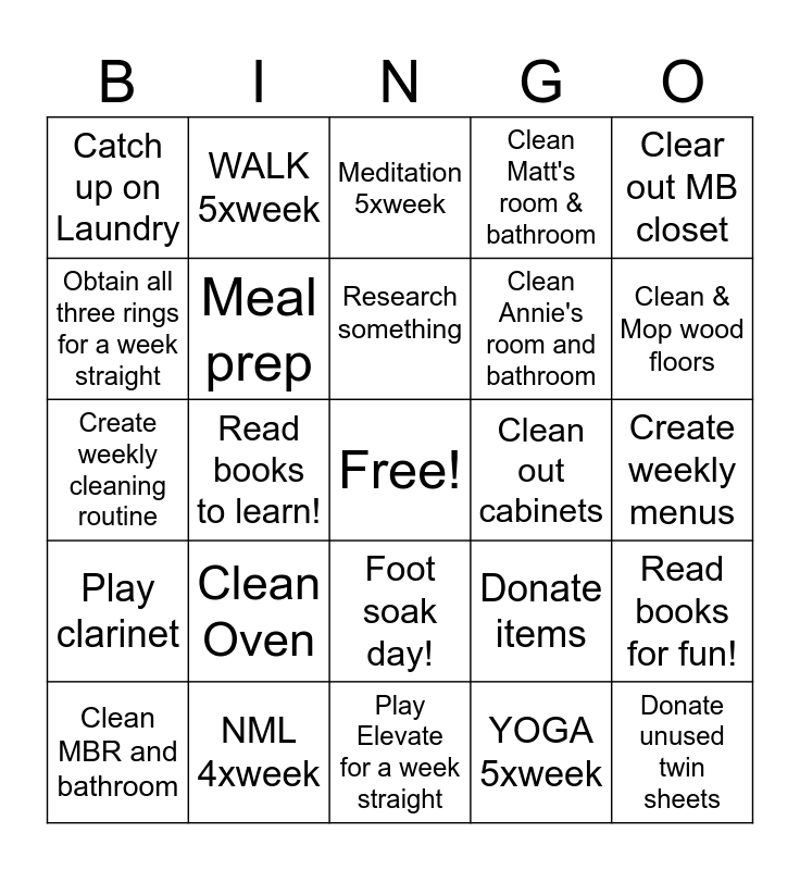 This bingo card has a free space and 24 words: Clean Oven, NML 4xweek, Research something, Clean MBR and bathroom, Clear out MB closet, Catch up on Laundry, Obtain all three rings for a week straight, WALK 5xweek, Clean out cabinets, Foot soak day!, Clean Annie's room and bathroom, Create weekly cleaning routine, Donate items, Read books for fun!, Meal prep, YOGA 5xweek, Create weekly menus, Meditation 5xweek, Clean & Mop wood floors, Read books to learn!, Donate unused twin sheets, Play clarinet, Clean Matt's room & bathroom and Play Elevate for a week straight.