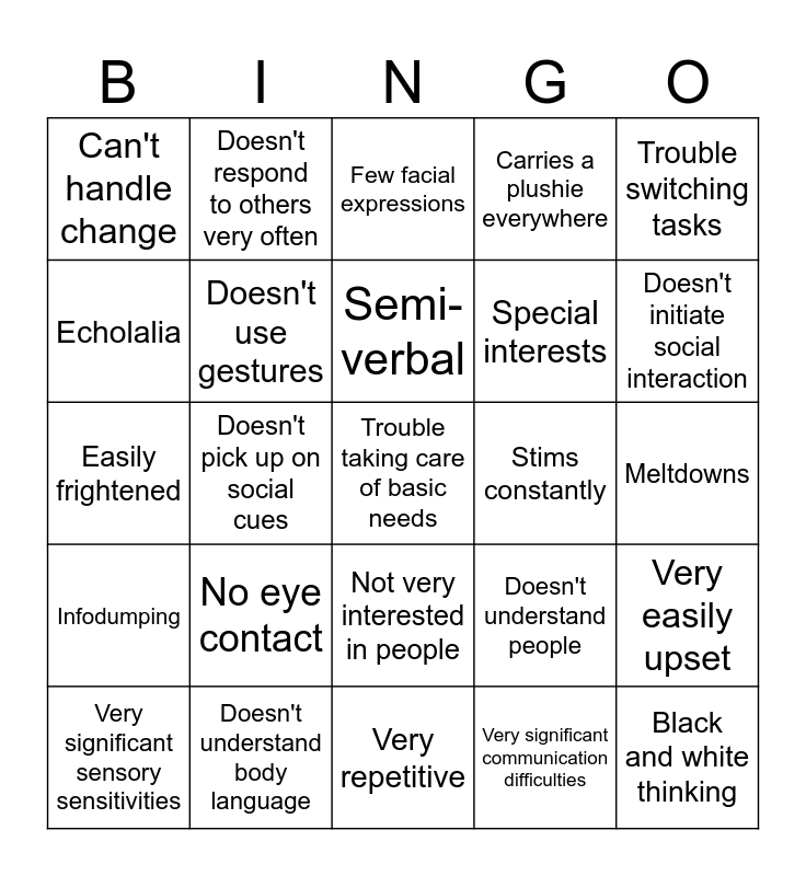 This bingo card has a free space and 24 words: No eye contact, Doesn't understand body language, Semi-verbal, Very significant sensory sensitivities, Trouble switching tasks, Can't handle change, Echolalia, Doesn't respond to others very often, Stims constantly, Not very interested in people, Special interests, Easily frightened, Doesn't understand people, Very easily upset, Doesn't use gestures, Very significant communication difficulties, Meltdowns, Few facial expressions, Doesn't initiate social interaction, Doesn't pick up on social cues, Black and white thinking, Infodumping, Carries a plushie everywhere and Very repetitive.