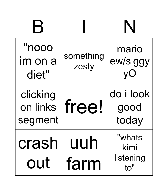 This bingo card has a free space and 8 words: do i look good today, mario ew/siggy yO, something zesty, crash out, "nooo im on a diet", "whats kimi listening to", clicking on links segment and uuh farm.