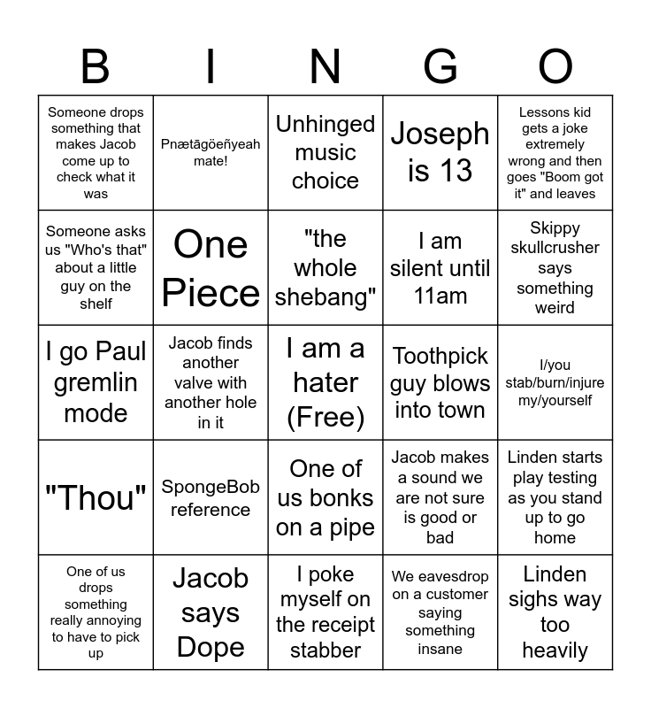 This bingo card has a free space and 24 words: SpongeBob reference, Jacob says Dope, "the whole shebang", One of us drops something really annoying to have to pick up, Lessons kid gets a joke extremely wrong and then goes "Boom got it" and leaves, Someone drops something that makes Jacob come up to check what it was, Someone asks us "Who's that" about a little guy on the shelf, Pnætāgöeñyeah mate!, Toothpick guy blows into town, One of us bonks on a pipe, I am silent until 11am, I go Paul gremlin mode, Jacob makes a sound we are not sure is good or bad, Linden starts play testing as you stand up to go home, One Piece, We eavesdrop on a customer saying something insane, I/you stab/burn/injure my/yourself, Unhinged music choice, Skippy skullcrusher says something weird, Jacob finds another valve with another hole in it, Linden sighs way too heavily, "Thou", Joseph is 13 and I poke myself on the receipt stabber.