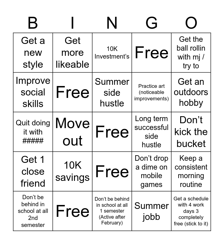 This bingo card has a free space and 24 words: 10K savings, Free, Summer side hustle, Don’t be behind in school at all 2nd semester, Get the ball rollin with mj / try to, Get a new style, Improve social skills, Get more likeable, Long term successful side hustle, Free, Practice art (noticeable improvements), Quit doing it with #####, Don’t drop a dime on mobile games, Keep a consistent morning routine, Free, Summer jobb, Don’t kick the bucket, 10K Investment’s, Get an outdoors hobby, Move out, Get a schedule with 4 work days 3 completely free (stick to it), Get 1 close friend, Free and Don’t be behind in school at all 1 semester (Active after February).