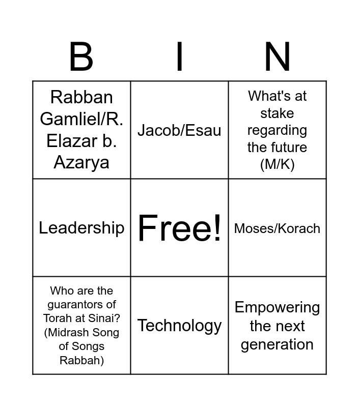 This bingo card has a free space and 8 words: Moses/Korach, What's at stake regarding the future (M/K), Jacob/Esau, Who are the guarantors of Torah at Sinai? (Midrash Song of Songs Rabbah), Rabban Gamliel/R. Elazar b. Azarya, Empowering the next generation, Leadership and Technology.