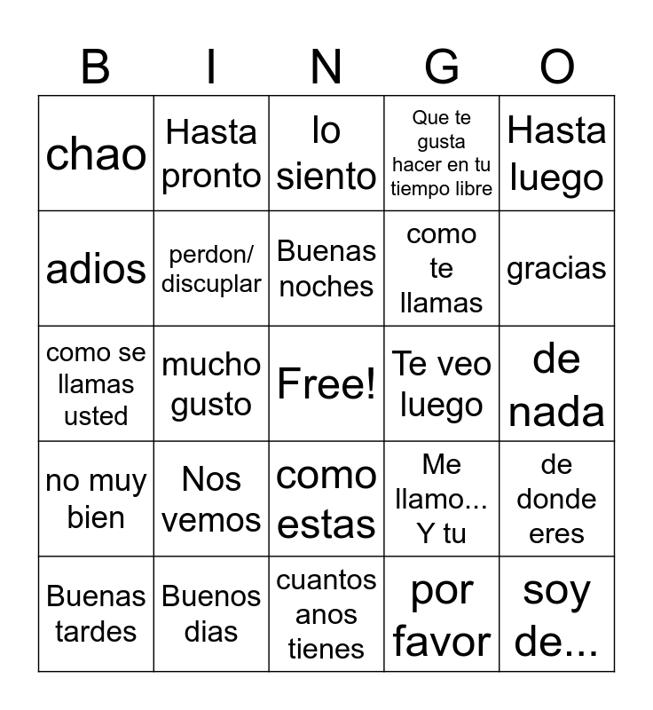 This bingo card has a free space and 24 words: Nos vemos, Buenos dias, Buenas noches, Buenas tardes, Hasta luego, chao, adios, Hasta pronto, Te veo luego, como estas, como te llamas, como se llamas usted, Me llamo... Y tu, de donde eres, perdon/ discuplar, por favor, de nada, lo siento, gracias, mucho gusto, soy de..., no muy bien, Que te gusta hacer en tu tiempo libre and cuantos anos tienes.