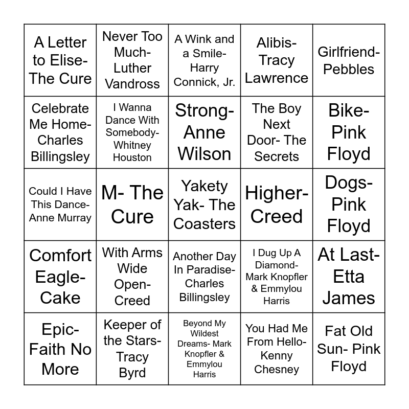 This bingo card has 65 words: Free!, (I’ve Had) The Time Of My Life- Bill Medley & Jennifer Warnes, Heartbreak Station- Cinderella, At Last- Etta James, Snowbird- Anne Murray, Funky Cold Medina- Tone-Loc, Never Too Much- Luther Vandross, Black Madonna- Cage the Elephant, Strong- Anne Wilson, No One- Alicia Keys, Another Day In Paradise- Charles Billingsley, The One That Got Away- Katy Perry, Dogs- Pink Floyd, Girlfriend- Pebbles, Save The Best For Last- Vanessa Williams, Celebrate Me Home- Charles Billingsley, M- The Cure, A Letter to Elise- The Cure, Fight For Your Right- Beastie Boys, The Boy Next Door- The Secrets, With Arms Wide Open- Creed, Comfort Eagle- Cake, Alibis- Tracy Lawrence, Take Me Home, Country Roads- John Denver, A Quiet Mind- Blue October, Paint Me A Birmingham- Tracy Lawrence, Lullaby- The Cure, Bleeding Love- Leona Lewis, Yakety Yak- The Coasters, Help Me Make It Through the Night- Sammi Smith, Epic- Faith No More, Summer Breeze- Seals and Crofts, How Will I Know- Whitney Houston, I’m Eighteen- Alice Cooper, I Dug Up A Diamond- Mark Knopfler & Emmylou Harris, Keeper of the Stars- Tracy Byrd, Good Time- Counting Crows, Could I Have This Dance- Anne Murray, You Had Me From Hello- Kenny Chesney, Charlie Brown- The Coasters, I Wanna Dance With Somebody- Whitney Houston, Astronomy Domine- Pink Floyd, Higher- Creed, Break My Stride- Matthew Wilder, How Forever Feels- Kenny Chesney, Behind Closed Doors- Charlie Rich, Bike- Pink Floyd, Comfortably Numb- Pink Floyd, Fat Old Sun- Pink Floyd, Endless Love- Luther Vandross & Mariah Carey, Sultans of Swing- Dire Straits, My Jesus- Anne Wilson, I Just Fall In Love Again- Anne Murray, Beyond My Wildest Dreams- Mark Knopfler & Emmylou Harris, I Will Survive- Gloria Gaynor, Banana Pancakes- Jack Johnson, Atom Heart Mother- Pink Floyd, A Wink and a Smile- Harry Connick, Jr., In The Still Of The Night- The Five Satins, Brown Eyed Girl- Van Morrison, Just Another Woman in Love- Anne Murray, Itsy Bitsy Teenie Weenie Yellow Polka Dot Bikini- Brian Hyland, Haven’t Met You Yet- Michael Bublé, Firework- Katy Perry and Can’t Stop- Red Hot Chili Peppers.