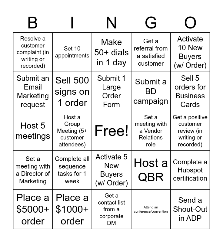 This bingo card has a free space and 27 words: Host a QBR, Complete an On-Site Visit, Submit a BD campaign, Get a contact list from a corporate DM, Submit an Email Marketing request, Make 50+ dials in 1 day, Set 10 appointments, Set a meeting with a Director of Marketing, Set a meeting with a Vendor Relations role, Complete a Hubspot certification, Host 5 meetings, Get a referral from a satisfied customer, Place a $5000+ order, Place a $1000+ order, Sell 5 orders for Business Cards, Sell 1 Event Tent, Sell 500 signs on 1 order, Submit 1 Large Order Form, Complete all sequence tasks for 1 week, Resolve a customer complaint (in writing or recorded), Get a positive customer review (in writing or recorded), Attend an conference/convention, Host a Group Meeting (5+ customer attendees), Send a Shout-Out in ADP, Activate 5 New Buyers (w/ Order), Activate 10 New Buyers (w/ Order) and Map a New Account.