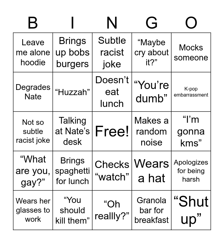 This bingo card has a free space and 24 words: Wears her glasses to work, Brings spaghetti for lunch, Doesn’t eat lunch, Granola bar for breakfast, Mocks someone, Leave me alone hoodie, Brings up bobs burgers, Subtle racist joke, Makes a random noise, “I’m gonna kms”, Not so subtle racist joke, “Huzzah”, Wears a hat, Apologizes for being harsh, Degrades Nate, “You should kill them”, “Oh reallly?”, “Maybe cry about it?”, K-pop embarrassment, “What are you, gay?”, Talking at Nate’s desk, Checks “watch”, “You’re dumb” and “Shut up”.
