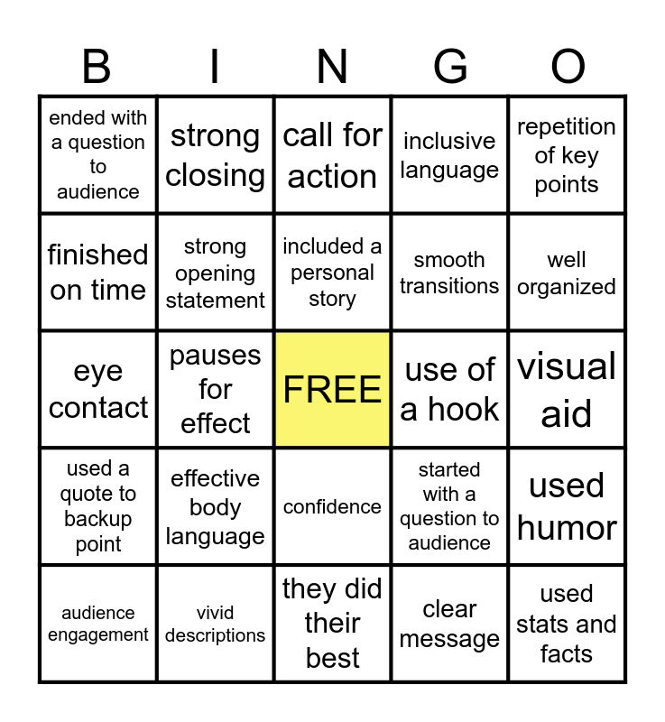 This bingo card has a free space and 24 words: effective body language, vivid descriptions, included a personal story, audience engagement, repetition of key points, ended with a question to audience, finished on time, strong closing, use of a hook, confidence, smooth transitions, eye contact, started with a question to audience, used humor, strong opening statement, clear message, visual aid, call for action, well organized, pauses for effect, used stats and facts, used a quote to backup point, inclusive language and they did their best.