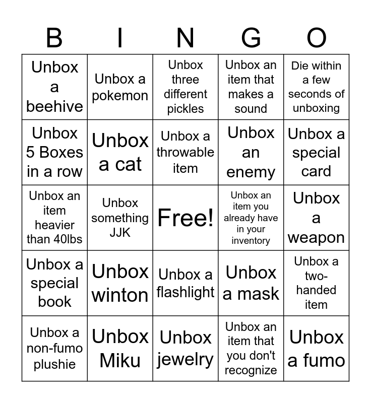 This bingo card has a free space and 24 words: Unbox winton, Unbox Miku, Unbox a throwable item, Unbox a non-fumo plushie, Die within a few seconds of unboxing, Unbox a beehive, Unbox 5 Boxes in a row, Unbox a pokemon, Unbox an item you already have in your inventory, Unbox a flashlight, Unbox an enemy, Unbox an item heavier than 40lbs, Unbox a mask, Unbox a two-handed item, Unbox a cat, Unbox an item that you don't recognize, Unbox a weapon, Unbox three different pickles, Unbox a special card, Unbox something JJK, Unbox a fumo, Unbox a special book, Unbox an item that makes a sound and Unbox jewelry.