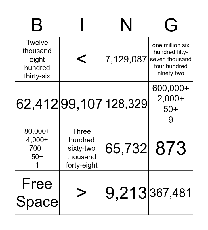 This bingo card has a free space and 15 words: Free Space, 367,481, 7,129,087, Twelve thousand eight hundred thirty-six, 600,000+ 2,000+ 50+ 9, 62,412, Three hundred sixty-two thousand forty-eight, 9,213, 99,107, 80,000+ 4,000+ 700+ 50+ 1, 873, one million six hundred fifty-seven thousand four hundred ninety-two, 128,329, < and >.