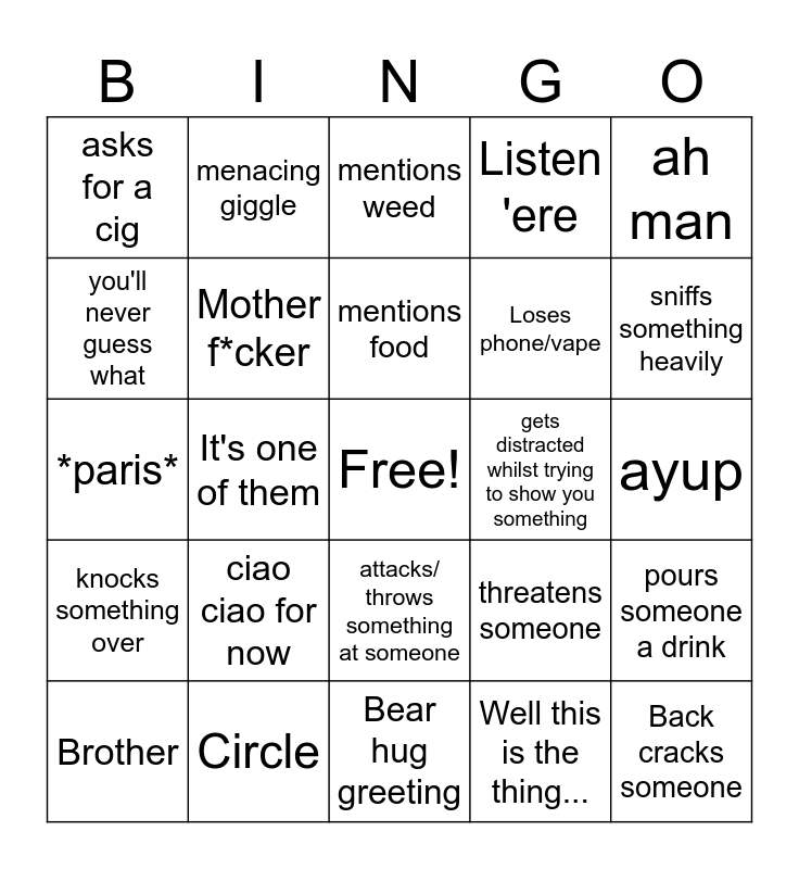 This bingo card has a free space and 24 words: Brother, ciao ciao for now, mentions food, Well this is the thing..., ah man, asks for a cig, menacing giggle, mentions weed, gets distracted whilst trying to show you something, ayup, *paris*, Mother f*cker, threatens someone, pours someone a drink, you'll never guess what, Circle, Bear hug greeting, Listen 'ere, sniffs something heavily, knocks something over, It's one of them, attacks/ throws something at someone, Loses phone/vape and Back cracks someone.