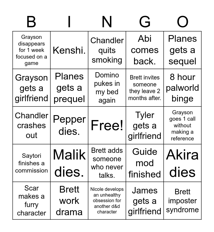 This bingo card has a free space and 24 words: Malik dies., Brett work drama, Domino pukes in my bed again, Scar makes a furry character, Planes gets a sequel, Grayson disappears for 1 week focused on a game, Grayson gets a girlfriend, Kenshi., Tyler gets a girlfriend, Brett adds someone who never talks., Brett invites someone they leave 2 months after., Chandler crashes out, Guide mod finished, Akira dies, Planes gets a prequel, James gets a girlfriend, Grayson goes 1 call without making a reference, Chandler quits smoking, 8 hour palworld binge, Pepper dies., Brett imposter syndrome, Saytori finishes a commission, Abi comes back. and Nicole develops an unhealthy obsession for another d&d character.
