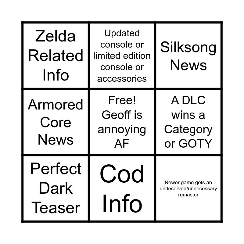 This bingo card has a free space and 24 words: FromSoftware Announcement, Wolverine Game News, Cod Info, Something Pokemon Related, Newer game gets an undeserved/unnecessary remaster, Zelda Related Info, A DLC wins a Category or GOTY, Updated console or limited edition console or accessories, Wukong DLC or Announcement, Resident Evil Reveal, Elder Scrolls 6 News, Bioshock 4, GTAVI Info, Gen 9 Update RDR1or2, Perfect Dark Teaser, Fable 4 Update/News, Switch 2 Announcement, Silksong News, Doom The Dark Ages Teaser or Info, Lies of P DLC, DK64 Announcement, Shitty VR Announcements that I don’t care about, Armored Core News and Fallout TV Series Trailer.