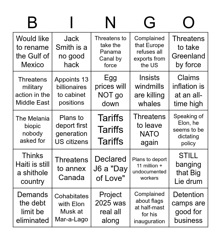 This bingo card has a free space and 24 words: Threatens to annex Canada, Cohabitates with Elon Musk at Mar-a-Lago, Egg prices will NOT go down, Demands the debt limit be eliminated, Threatens to take Greenland by force, Would like to rename the Gulf of Mexico, Threatens military action in the Middle East, Jack Smith is a no good hack, Threatens to leave NATO again, Declared J6 a "Day of Love", Insists windmills are killing whales, The Melania biopic nobody asked for, Plans to deport 11 million + undocumented workers, STILL banging that Big Lie drum, Appoints 13 billionaires to cabinet positions, Complained about flags at half-mast for his inauguration, Speaking of Elon, he seems to be dictating policy, Threatens to take the Panama Canal by force, Claims inflation is at an all-time high, Plans to deport first generation US citizens, Detention camps are good for business, Thinks Haiti is still a shithole country, Complained that Europe refuses all exports from the US and Project 2025 was real all along.