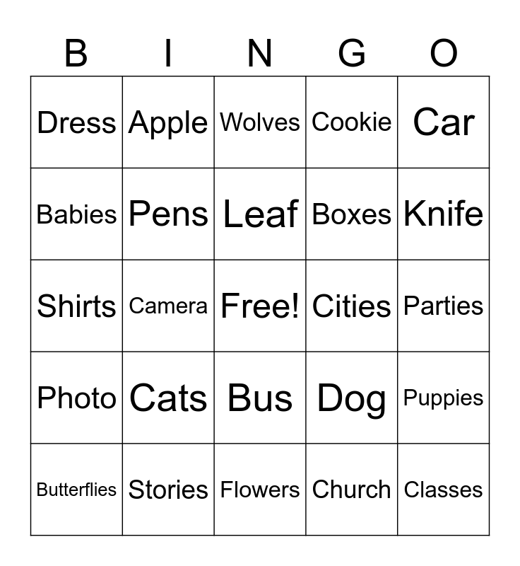 This bingo card has a free space and 24 words: Cats, Stories, Leaf, Butterflies, Car, Dress, Babies, Apple, Cities, Bus, Boxes, Shirts, Dog, Puppies, Pens, Church, Parties, Wolves, Knife, Camera, Classes, Photo, Cookie and Flowers.