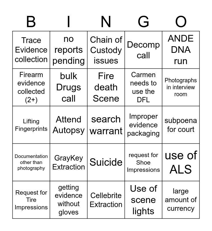This bingo card has 35 words: *Real* Homicide, call out for DNA evidence, collecting Patent Prints, bulk Drugs call, Suicide, Decomp call, Firearm evidence collected (2+), incorrect Evidence entry (grouped), Fire death Scene, collecting Digital Evidence, Lifting Fingerprints, ANDE DNA run, 15+ evidence items collected, Special Photography needed, Trace Evidence collection, Improper evidence packaging, Use of scene lights, Attend Autopsy, Documentation other than photography, search warrant, request for Shoe Impressions, Request for Tire Impressions, use of ALS, getting evidence without gloves, Chain of Custody issues, Photographs in interview room, large amount of currency, Lt. wants to see the lab/evidence room, Carmen needs to use the DFL, subpoena for court, Randox Run, Cellebrite Extraction, GrayKey Extraction, no reports pending and made it to work on time all week.