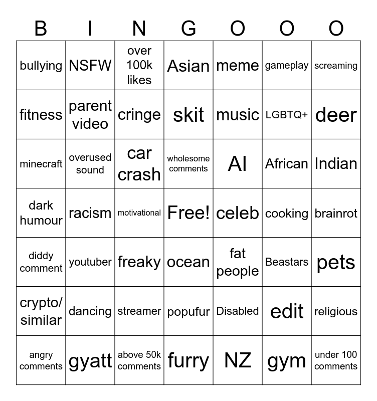 This bingo card has a free space and 48 words: Disabled, LGBTQ+, furry, racism, car crash, brainrot, NSFW, gyatt, gameplay, ocean, screaming, Asian, African, AI, crypto/ similar, cooking, fitness, deer, edit, meme, music, motivational, bullying, parent video, religious, cringe, Indian, angry comments, wholesome comments, overused sound, gym, celeb, pets, dancing, dark humour, fat people, Beastars, minecraft, freaky, streamer, diddy comment, under 100 comments, over 100k likes, above 50k comments, skit, popufur, youtuber and NZ.