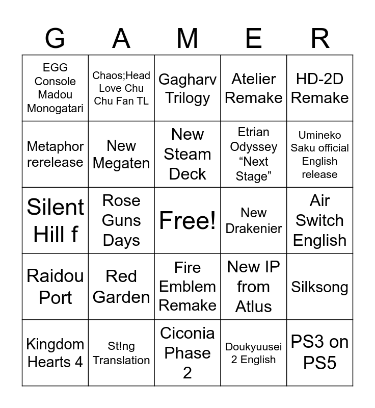 This bingo card has a free space and 24 words: Red Garden, St!ng Translation, New Steam Deck, Kingdom Hearts 4, HD-2D Remake, EGG Console Madou Monogatari, Metaphor rerelease, Chaos;Head Love Chu Chu Fan TL, New Drakenier, Fire Emblem Remake, Etrian Odyssey “Next Stage”, Silent Hill f, New IP from Atlus, Silksong, New Megaten, Doukyuusei 2 English, Air Switch English, Gagharv Trilogy, Umineko Saku official English release, Rose Guns Days, PS3 on PS5, Raidou Port, Atelier Remake and Ciconia Phase 2.