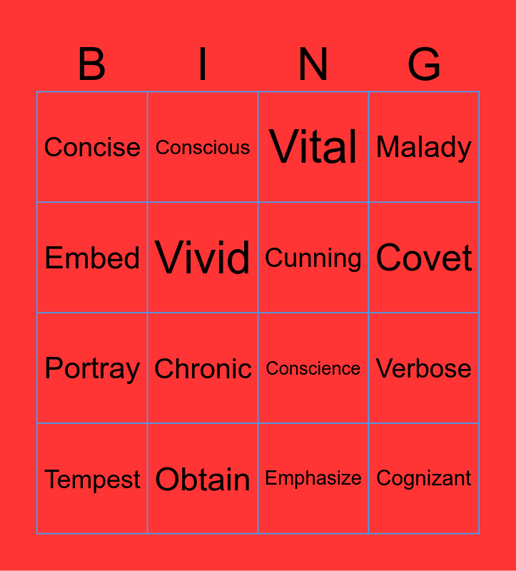 This bingo card has 16 words: Obtain, Verbose, Vital, Concise, Portray, Conscious, Conscience, Emphasize, Embed, Vivid, Tempest, Malady, Chronic, Covet, Cunning and Cognizant.