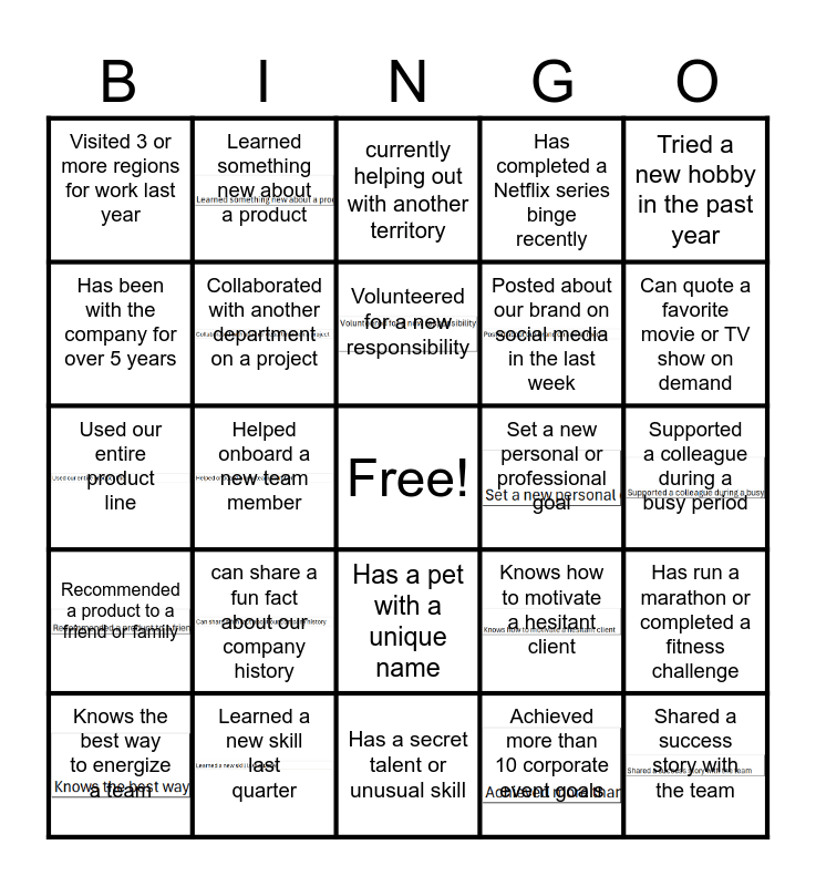 This bingo card has 15 images, a free space and 24 words: can share a fun fact about our company history, Learned a new skill last quarter, Volunteered for a new responsibility, Knows the best way to energize a team, Tried a new hobby in the past year, Visited 3 or more regions for work last year, Has been with the company for over 5 years, Learned something new about a product, Set a new personal or professional goal, Has a pet with a unique name, Posted about our brand on social media in the last week, Used our entire product line, Knows how to motivate a hesitant client, Has run a marathon or completed a fitness challenge, Collaborated with another department on a project, Achieved more than 10 corporate event goals, Supported a colleague during a busy period, currently helping out with another territory, Can quote a favorite movie or TV show on demand, Helped onboard a new team member, Shared a success story with the team, Recommended a product to a friend or family, Has completed a Netflix series binge recently and Has a secret talent or unusual skill.
