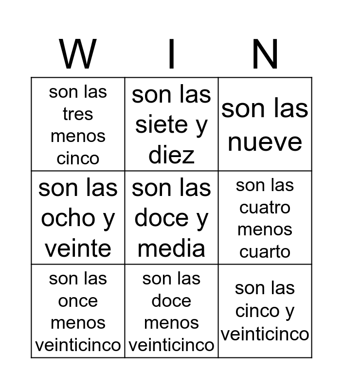 This bingo card has 12 words: es la uno y veinte, son las cinco y veinticinco, son las doce y media, son las cuatro menos cuarto, son las siete y diez, son las nueve, son las doce menos veinticinco, son las cuatro y cinco, son las tres menos cinco, son las ocho y veinte, son las once menos veinticinco and son las siete menos veinte.