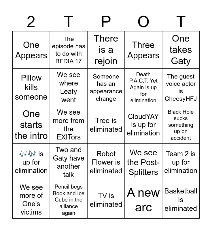 This bingo card has 25 words: Two and Gaty have another talk, TV is eliminated, Someone has an appearance change, We see more of One's victims, One takes Gaty, One Appears, Pillow kills someone, The episode has to do with BFDIA 17, CloudYAY is up for elimination, Robot Flower is eliminated, Death P.A.C.T. Yet Again is up for elimination, One starts the intro, We see the Post-Splitters, Team 2 is up for elimination, We see where Leafy went, Basketball is eliminated, Black Hole sucks something up on accident, There is a rejoin, The guest voice actor is CheesyHFJ, We see more from the EXITors, Tree is eliminated, Pencil begs Book and Ice Cube in the alliance again, πΆπΆ is up for elimination, Three Appears and A new arc.