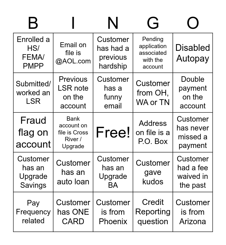 This bingo card has a free space and 24 words: Customer has an auto loan, Customer has ONE CARD, Customer has a funny email, Pay Frequency related, Disabled Autopay, Enrolled a HS/ FEMA/ PMPP, Submitted/ worked an LSR, Email on file is @AOL.com, Address on file is a P.O. Box, Customer has an Upgrade BA, Customer from OH, WA or TN, Fraud flag on account, Customer gave kudos, Customer had a fee waived in the past, Previous LSR note on the account, Credit Reporting question, Customer has never missed a payment, Customer has had a previous hardship, Double payment on the account, Bank account on file is Cross River / Upgrade, Customer is from Arizona, Customer has an Upgrade Savings, Pending application associated with the account and Customer is from Phoenix.