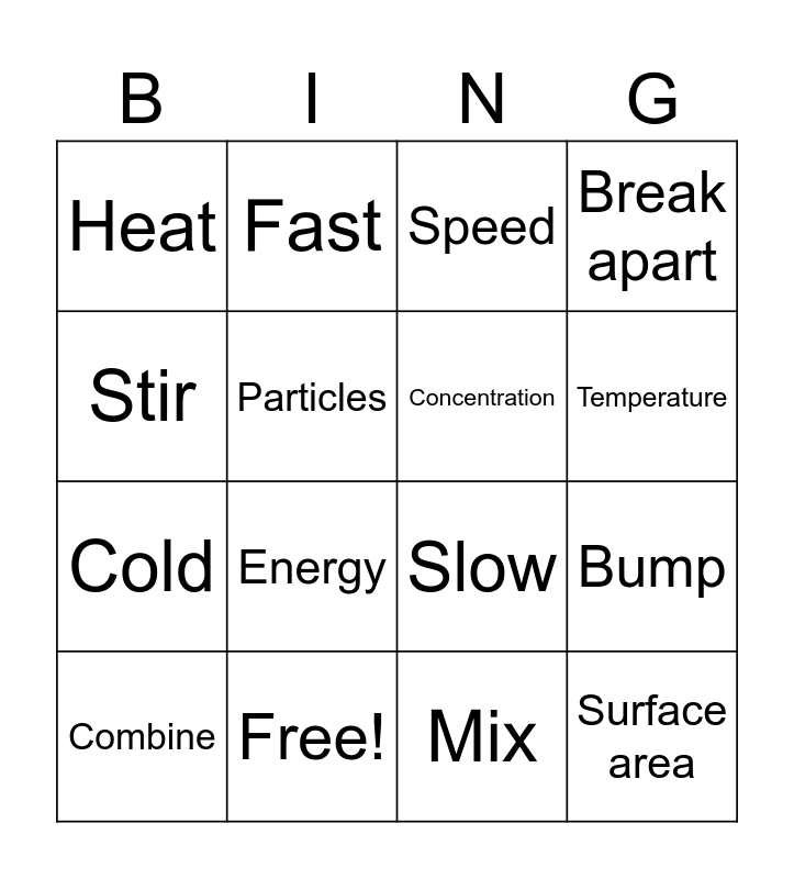 This bingo card has 16 words: Free!, Bump, Speed, Heat, Cold, Fast, Slow, Mix, Stir, Particles, Combine, Break apart, Energy, Temperature, Concentration and Surface area.