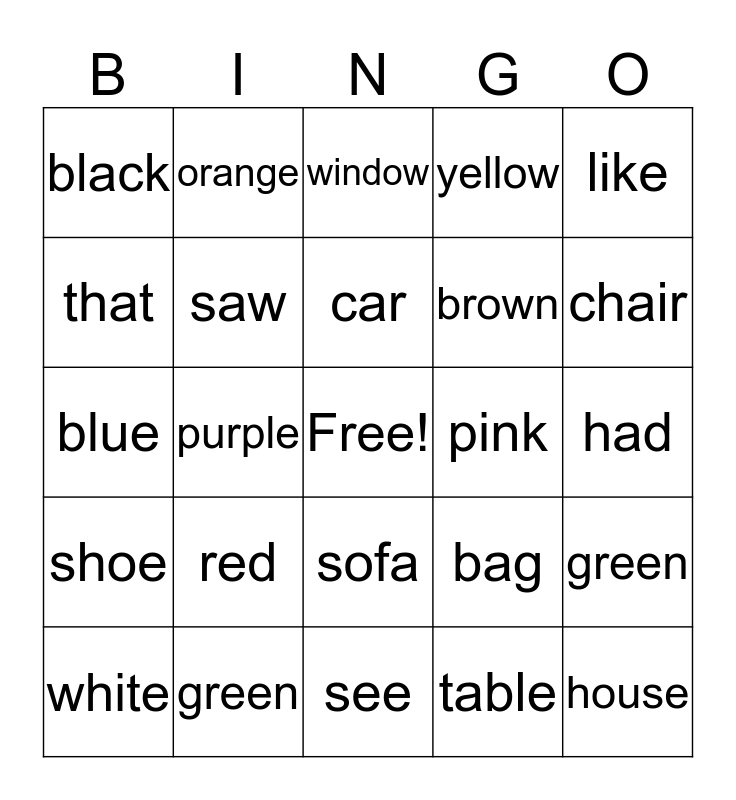 This bingo card has a free space and 24 words: red, green, car, white, like, black, that, orange, pink, sofa, brown, blue, bag, green, saw, table, had, window, chair, purple, house, shoe, yellow and see.
