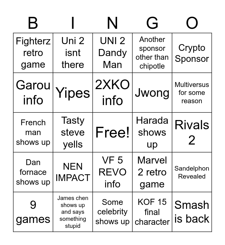 This bingo card has a free space and 24 words: NEN IMPACT, James chen shows up and says something stupid, 2XKO info, 9 games, Crypto Sponsor, Fighterz retro game, Garou info, Uni 2 isnt there, Harada shows up, VF 5 REVO info, Jwong, French man shows up, Marvel 2 retro game, Sandelphon Revealed, Yipes, KOF 15 final character, Rivals 2, UNI 2 Dandy Man, Multiversus for some reason, Tasty steve yells, Smash is back, Dan fornace shows up, Another sponsor other than chipotle and Some celebrity shows up.