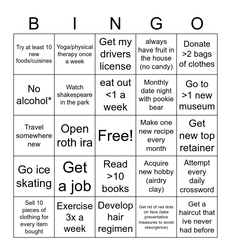 This bingo card has a free space and 24 words: Get a job, Exercise 3x a week, eat out <1 a week, Sell 10 pieces of clothing for every item bought, Donate >2 bags of clothes, Try at least 10 new foods/cuisines, No alcohol*, Yoga/physical therapy once a week, Make one new recipe every month, Read >10 books, Monthly date night with pookie bear, Travel somewhere new, Acquire new hobby (airdry clay), Attempt every daily crossword, Watch shakespeare in the park, Get rid of red dots on face (take preventative measures to avoid resurgence), Get new top retainer, Get my drivers license, Go to >1 new museum, Open roth ira, Get a haircut that ive never had before, Go ice skating, always have fruit in the house (no candy) and Develop hair regimen.