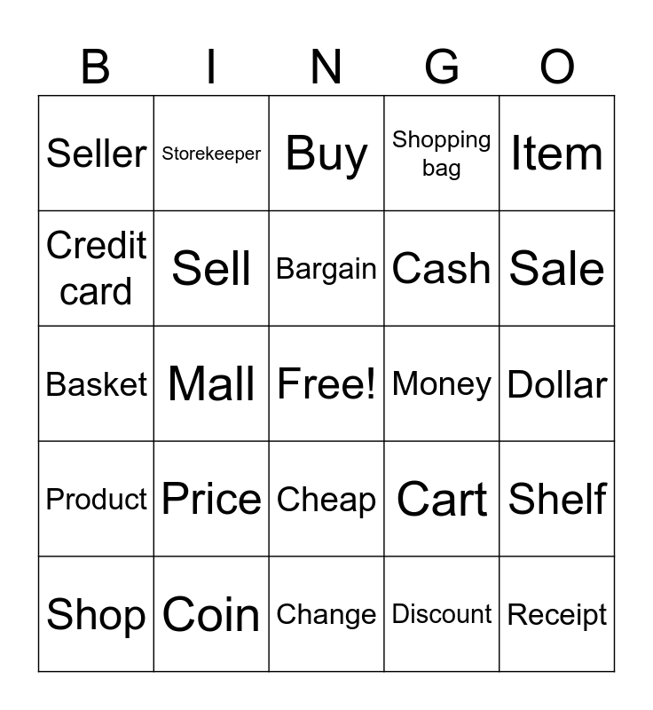 This bingo card has a free space and 29 words: Shop, Market, Mall, Customer, Seller, Buy, Sell, Price, Money, Coin, Dollar, Receipt, Change, Discount, Sale, Expensive, Cheap, Product, Item, Basket, Cart, Pay, Cash, Credit card, Shopping bag, Storekeeper, Shelf, Bargain and Goods.