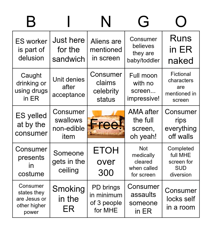 This bingo card has a free space and 24 words: Someone gets in the ceiling, Smoking in the ER, Consumer claims celebrity status, Consumer states they are Jesus or other higher power, Runs in ER naked, ES worker is part of delusion, Caught drinking or using drugs in ER, Just here for the sandwich, AMA after the full screen, oh yeah!, ETOH over 300, Full moon with no screen... impressive!, ES yelled at by the consumer, Not medically cleared when called for screen, Completed full MHE screen for SUD diversion, Unit denies after acceptance, Consumer assaults someone in ER, Consumer rips everything off walls, Aliens are mentioned in screen, Fictional characters are mentioned in screen, Consumer swallows non-edible item, Consumer locks self in a room, Consumer presents in costume, Consumer believes they are baby/toddler and PD brings in minimum of 3 people for MHE.