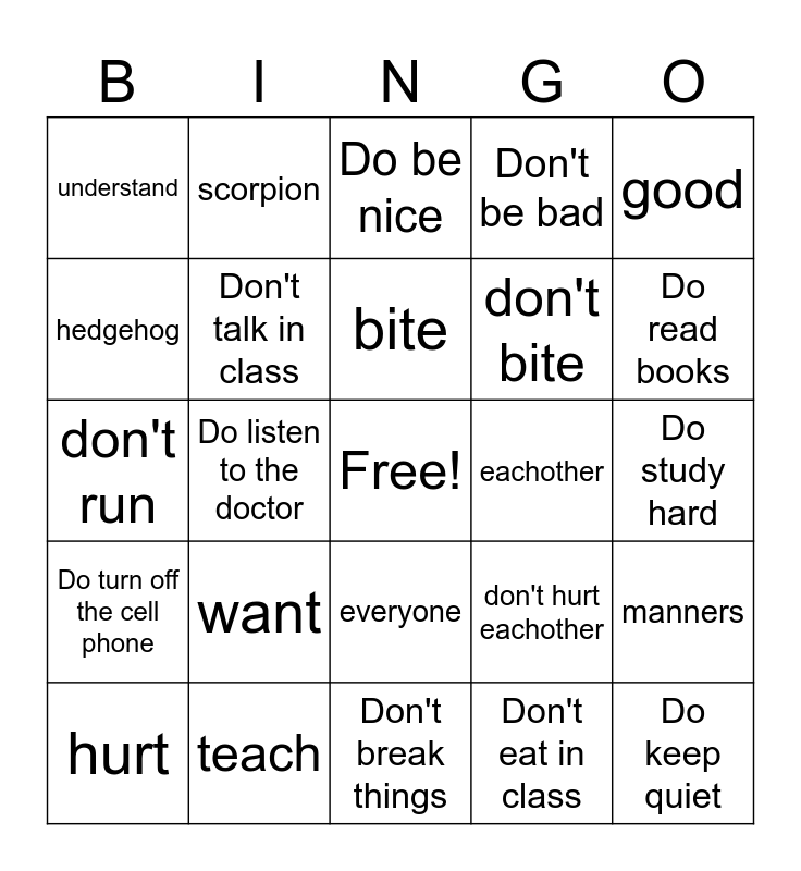 This bingo card has a free space and 24 words: want, teach, bite, hurt, good, understand, hedgehog, scorpion, eachother, everyone, don't bite, don't run, don't hurt eachother, manners, Don't talk in class, Don't eat in class, Do study hard, Do be nice, Do read books, Do listen to the doctor, Do keep quiet, Do turn off the cell phone, Don't be bad and Don't break things.