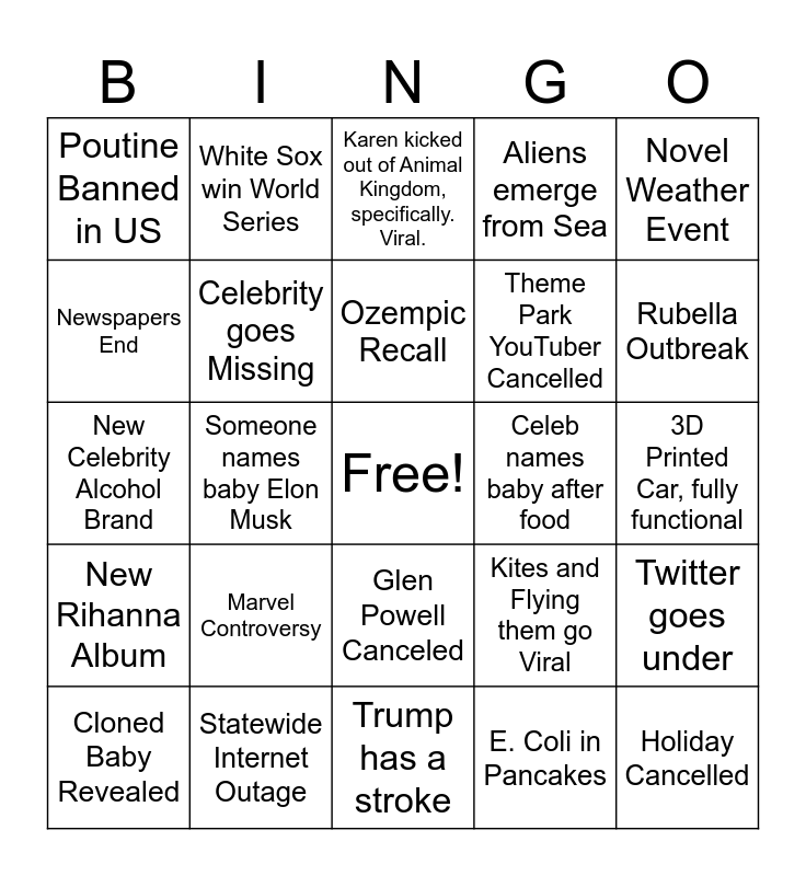 This bingo card has a free space and 24 words: Marvel Controversy, Statewide Internet Outage, Ozempic Recall, Cloned Baby Revealed, Novel Weather Event, Poutine Banned in US, Newspapers End, White Sox win World Series, Celeb names baby after food, Glen Powell Canceled, Theme Park YouTuber Cancelled, New Celebrity Alcohol Brand, Kites and Flying them go Viral, Twitter goes under, Celebrity goes Missing, E. Coli in Pancakes, 3D Printed Car, fully functional, Karen kicked out of Animal Kingdom, specifically. Viral., Rubella Outbreak, Someone names baby Elon Musk, Holiday Cancelled, New Rihanna Album, Aliens emerge from Sea and Trump has a stroke.