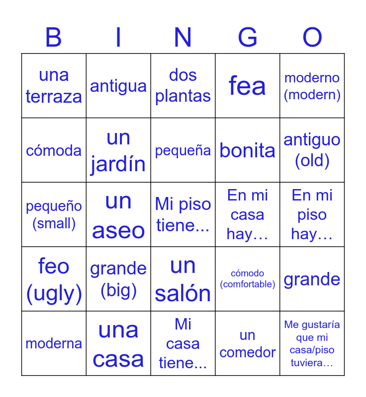 This bingo card has 30 words: una casa, una cocina, un aseo, un dormitorio, una terraza, dos plantas, un jardín, un salón, En mi casa hay…, Mi casa tiene..., En mi piso hay…, Mi piso tiene..., un comedor, Me gustaría que mi casa/piso tuviera…, antiguo (old), bonito (pretty), cómodo (comfortable), feo (ugly), grande (big), moderno (modern), pequeño (small), viejo (old), antigua, bonita, cómoda, fea, grande, moderna, pequeña and vieja.
