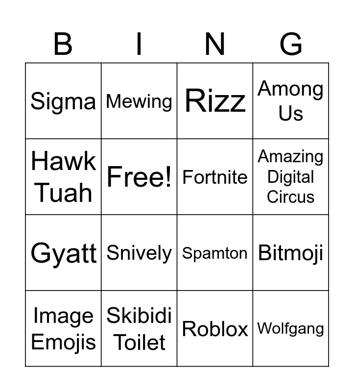 This bingo card has 16 words: Skibidi Toilet, Bitmoji, Rizz, Sigma, Gyatt, Mewing, Spamton, Roblox, Hawk Tuah, Free!, Image Emojis, Among Us, Snively, Amazing Digital Circus, Fortnite and Wolfgang.
