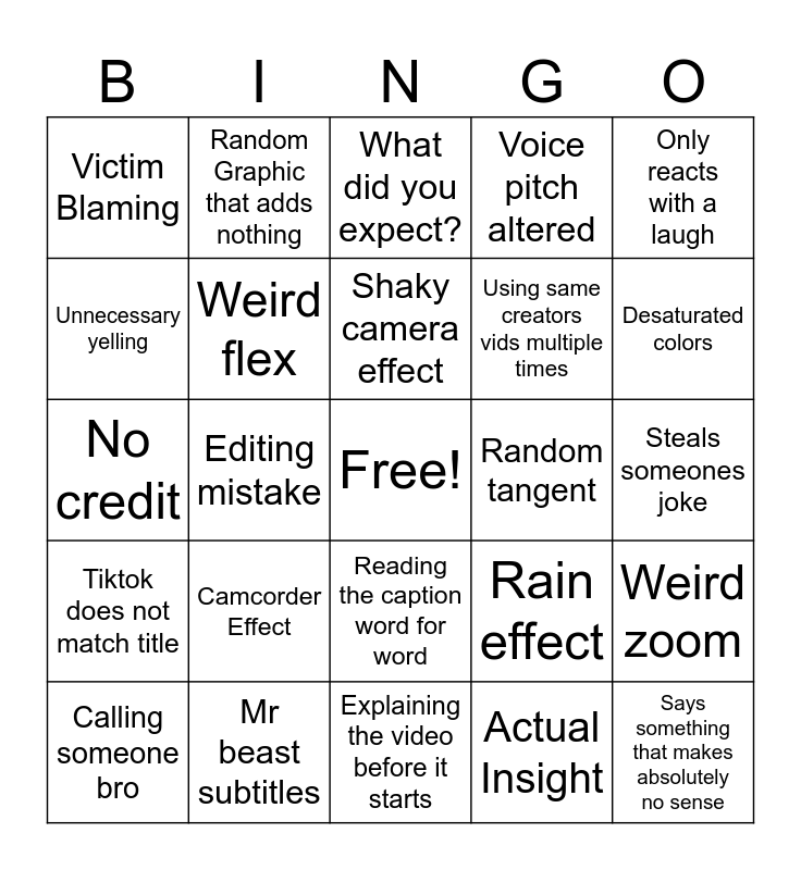 This bingo card has a free space and 24 words: Camcorder Effect, Mr beast subtitles, Shaky camera effect, Calling someone bro, Only reacts with a laugh, Victim Blaming, Unnecessary yelling, Random Graphic that adds nothing, Random tangent, Reading the caption word for word, Using same creators vids multiple times, No credit, Rain effect, Weird zoom, Weird flex, Actual Insight, Steals someones joke, What did you expect?, Desaturated colors, Editing mistake, Says something that makes absolutely no sense, Tiktok does not match title, Voice pitch altered and Explaining the video before it starts.