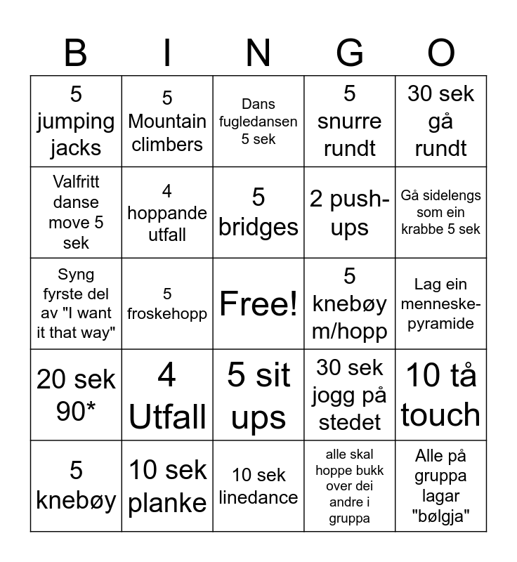 This bingo card has a free space and 24 words: 4 Utfall, 10 sek planke, 5 bridges, 5 knebøy, 30 sek gå rundt, 5 jumping jacks, Valfritt danse move 5 sek, 5 Mountain climbers, 5 knebøy m/hopp, 5 sit ups, 2 push-ups, Syng fyrste del av "I want it that way", 30 sek jogg på stedet, 10 tå touch, 4 hoppande utfall, alle skal hoppe bukk over dei andre i gruppa, Lag ein menneske-pyramide, Dans fugledansen 5 sek, Gå sidelengs som ein krabbe 5 sek, 5 froskehopp, Alle på gruppa lagar "bølgja", 20 sek 90*, 5 snurre rundt and 10 sek linedance.