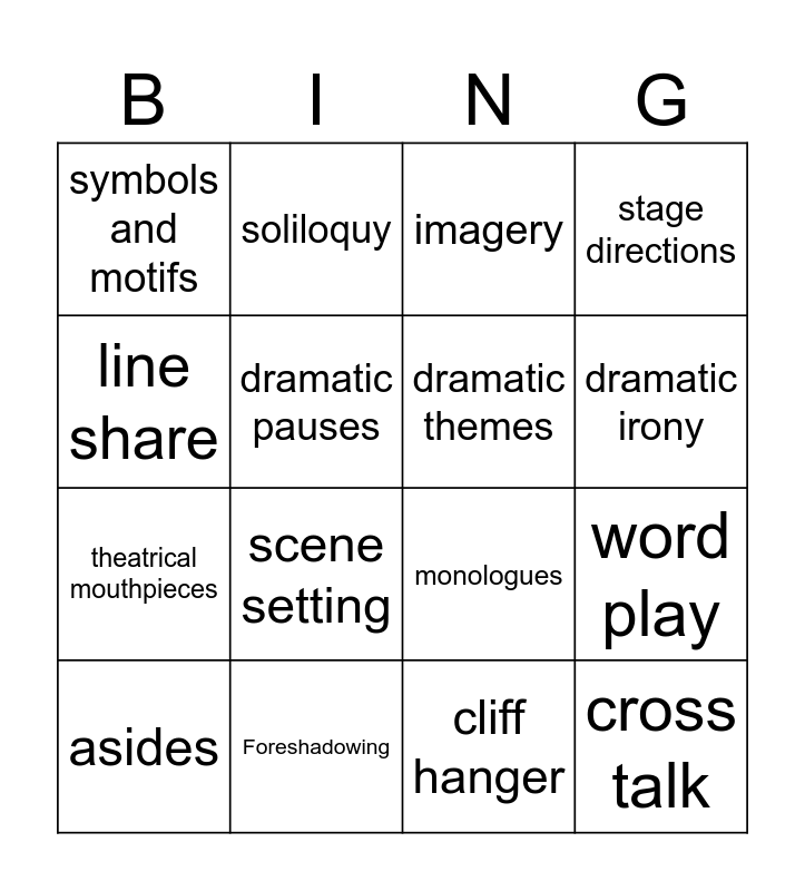 This bingo card has 16 words: Foreshadowing, word play, imagery, symbols and motifs, theatrical mouthpieces, soliloquy, monologues, cliff hanger, line share, dramatic pauses, asides, stage directions, scene setting, dramatic irony, dramatic themes and cross talk.