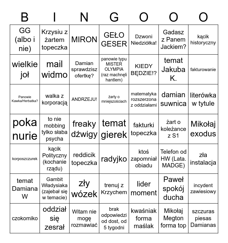 This bingo card has a free space and 48 words: lider moment, temat Jakuba K., brak odpowiedzi od dost, od 5 tygodni, to nie mobbing tylko słaba psycha, ANDRZEJU!, Mikołaj exodus, Krzysiu z żartem topeczka, oddział się zesrał, Gadasz z Panem Jackiem?, radyjko, kącik historyczny, GEŁO GESER, damian suwnica, matematyka rozszerzona z oddziałami, temat Damiana W, żart o koleżance z S1, wielkie joł, fakturowanie, Paweł spokój ducha, Dzwoni Niedziółka!, KIEDY BĘDZIE!?, freaky dźwigy, GG (albo i nie), mail widmo, incydent zawiesiowy, Damian sprawdzisz ofertkę?, literówka w tytule, czokomiko, żarty o mniejszościach, walka z korporacją, Mikołaj Megton forma top, fakturki topeczka, zła instalacja, Gambit Władysiaka (zajebał się w temacie), poka nurie, ktoś zapomniał obiadu, Telefon od HW (Lata. MADGE), Panowie Kawka/Herbatka?, reddicik topeczka, zły wózek, korposzczurek, szczuras piesas Damianas, MIRON, Witam nie mogę rozmawiać, panowie typu MISTER OLYMPIA (raz machnęli hantlem), trenuj z Krzychem, kącik Polityczny (kochanie rządu) and kwaśniak forma maślak.