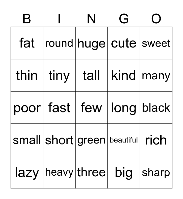 This bingo card has 26 words: green, big, tall, heavy, sweet, fat, thin, round, black, beautiful, kind, poor, rich, lazy, fast, smooth, cute, small, huge, few, many, three, long, short, tiny and sharp.