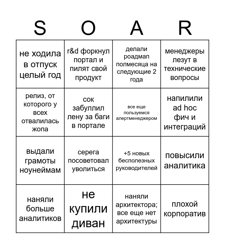This bingo card has 16 words: не купили диван, повысили аналитика, делали роадмап полмесяца на следующие 2 года, не ходила в отпуск целый год, выдали грамоты ноунеймам, r&d форкнул портал и пилят свой продукт, +5 новых бесполезных руководителей, наняли архитектора; все еще нет архитектуры, релиз, от которого у всех отвалилась жопа, сок забуллил лену за баги в портале, наняли больше аналитиков, менеджеры лезут в технические вопросы, серега посоветовал уволиться, напилили ad hoc фич и интеграций, все еще пользуемся алертменеджером and плохой корпоратив.