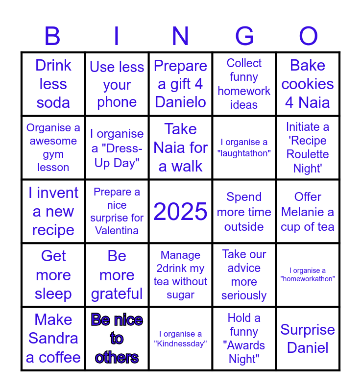 This bingo card has a free space and 24 words: Be more grateful, Be nice to others, Take Naia for a walk, Make Sandra a coffee, Bake cookies 4 Naia, Drink less soda, Organise a awesome gym lesson, Use less your phone, Spend more time outside, Manage 2drink my tea without sugar, I organise a "laughtathon", I invent a new recipe, Take our advice more seriously, I organise a "homeworkathon", I organise a "Dress-Up Day", Hold a funny "Awards Night", Offer Melanie a cup of tea, Prepare a gift 4 Danielo, Initiate a 'Recipe Roulette Night', Prepare a nice surprise for Valentina, Surprise Daniel, Get more sleep, Collect funny homework ideas and I organise a "Kindnessday".