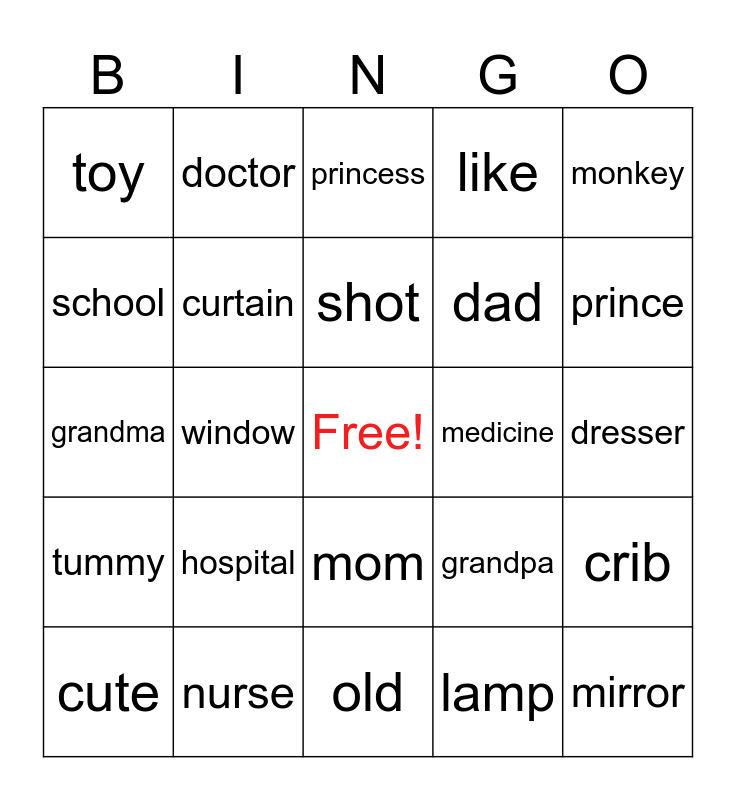 This bingo card has a free space and 24 words: hospital, nurse, shot, cute, monkey, toy, school, doctor, medicine, mom, dad, grandma, grandpa, crib, curtain, lamp, dresser, princess, prince, window, mirror, tummy, like and old.