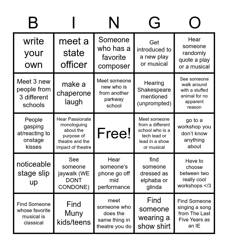 This bingo card has a free space and 73 words: write your own, write your own, write your own, Hear someone singing a musical while walking around, see someone (not in our troupe) skipping, meet someone not from the stl area, noticeable stage slip up, win a game in a workshop/event, find someone dressed as elphaba or glinda, find another school doing addams family, find a school that has done or is doing harvey, be asked if you have xx duck, make a chaperone laugh, go to a workshop you don’t know anything about, meet 10 new people, meet a state officer, meet someone who does the same thing in theatre you do, Meet 3 new people from 3 different schools, Meet someone from a different school who is working as ensemble or crew in the state musical, Meet someone from a different school who is a tech lead or lead in a show or musical, Meet someone new who is from another parkway school, Get introduced to a new play or musical, Hear someone randomly quote a play or a musical, Learn 3 fun facts about a new person, Find Someone whose favorite musical is classical, Find Someone whose favorite is Ride the Cyclone/Hadestown, Find Someone whose doesn’t like Sondheim (if you find them judge them), Find Someone who is a triple threat, Find Someone who hates musicals, Find Someone who used to or currently goes to Coca Stages or GCPA, Find Muny kids/teens, Not be able to find Gossett, Find Someone who owns a vocal nebulizer, Go two hours without hearing the word “slay” or “girl” or “honey” or other adjacent slang, Hear Passionate monologuing about the purpose of theatre and the impact of theatre, Find Someone who’s been to New York, Wish someone auditioning for a scholarship luck!!!, Epic: the Musical mentioned (eugh), Find Someone singing a song from The Last Five Years as an IE, Find someone who tolerates be more chill, Find someone wearing a show shirt, See someone jaywalk (WE DONT CONDONE), Be in a Cramped elevator, Get a college pamphlet, Have an Instructor late to their own class, Hearing Shakespeare mentioned (unprompted), Someone who has a favorite composer, Someone who prefers the mean girls musical over the movie, Someone very opinionated about the 2017 Tony awards (just ask joe..), People gasping at/reacting to onstage kisses, Be asked to be in another groups publicity thing, Have to run across venue to make it on time somewhere, Hear someone say ‘break a leg’, Trip, See someone cry due to a show (watching or performing), Compliment a strangers outfit, Hear ‘thank you *insert time*!’, Hear someone’s phone go off mid performance, Hear ‘less is more’, Ask a question during a workshop, Witness an emotional goodbye hug, Hear someone quote a musical/play in conversation, Enjoy an improv routine, See someone walk around with a stuffed animal for no apparent reason, Hear someone call a show ‘overrated’, Hear someone arguing about “emilia Perez’ winning over so many shows at The golden globes, Get annoyed by Avery, Regret not going to a workshop, Have to choose between two really cool workshops </3, Find someone who does a sport aswell as theatre, Find someone who does speech and debate aswell as theatre, See someone juggle and See a chaperone with far too many pins on their landyard.